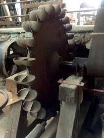 The tour guide explained that the Pelton Water Wheel was invented in the 1870's. Each scoop is divided in two equal sections (see last photo for a good view). According to the tour guide this design transfers more energy to the water wheel than traditional waterwheels. He was proud to report that he saw a Pelton Water Wheel among the massive hydro-electric generators at Hoover Dam.